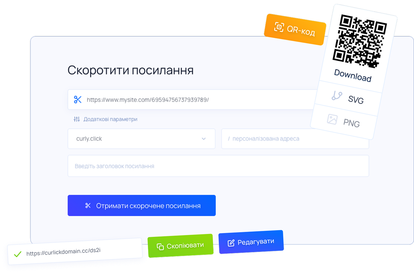 Скорочуй посилання за кілька кліків — додавай заголовки, персоналізовані адреси, створюй QR-коди та редагуй їх у будь-який момент.