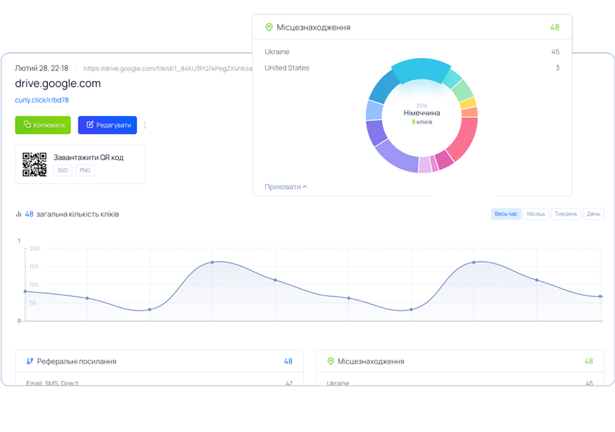 Переглядай джерела переходів, географію користувачів, пристрої та браузери. Вимірюй ефективність кожного лінка та оптимізуй свій контент.